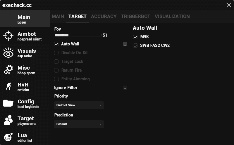 Silent, HitScan, Ignore filter, Priority Filter, Predict Customization, Target Lock, Disable on Kill, Fov Check, Triggerbot, Smooth Aim, Snapline, Legit-mode under observation.